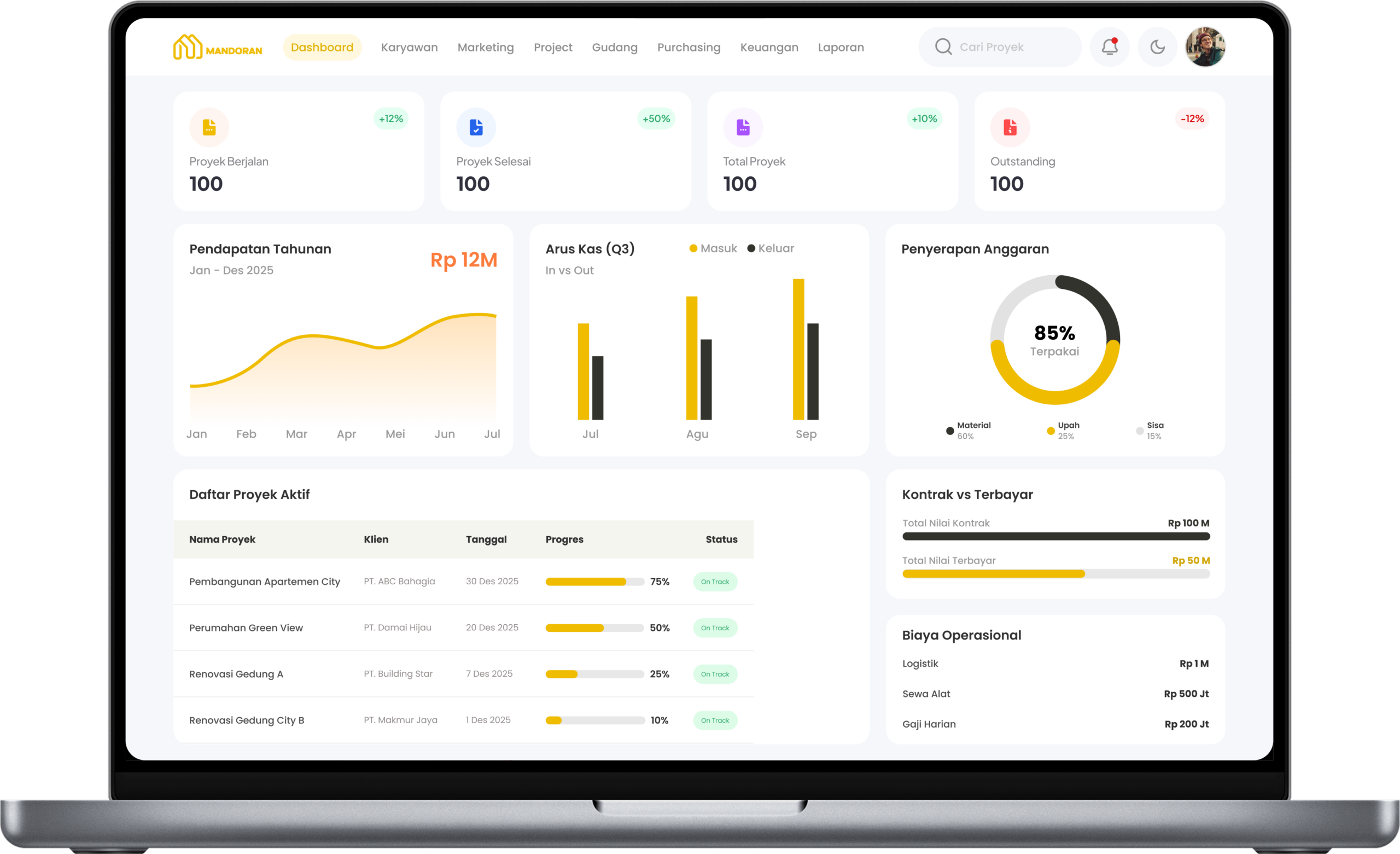 Mandoran bantu kontraktor mengelola proyek, anggaran, material, & laporan keuangan dalam satu sistem terintegrasi.